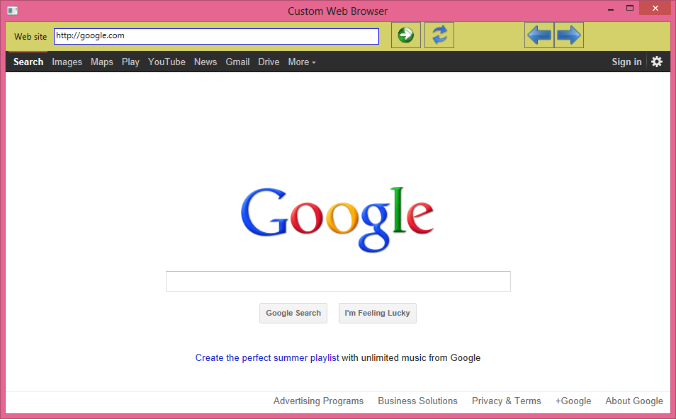Have you ever wanted to create a custom web browser? I will show you how to create a very simple custom web browser using WPF and C# with very little code. A web browser is a software application for retrieving, presenting and traversing information resources on the World Wide Web. The major web browsers are Google Chrome, Mozilla Firefox, Internet Explorer, Opera, and Safari. Feel free to experiment with the code and customize it as much as you want. This very simple browser only as a back, address bar, forward, go and refresh button. The Back and forward buttons go back to the previous resource and forward respectively. The refresh or reload button reload the current resource. The address bar input the Uniform Resource Identifier (URI) of the desired resource and display it.